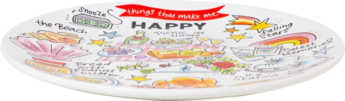 This make me happy! Dit vrolijke (ontbijt) bord, maakt jouw tafel nog gezelliger! De opvallende en kleurrijke illustraties zijn in het thema Happy ontworpen. Op het bord staan allemaal grappige quotes die jou blij maken. Zoals picknick at home, falling stars, sweet memories en hot tea. Dit bord is leuk te combineren met de andere nieuwe Happy items.