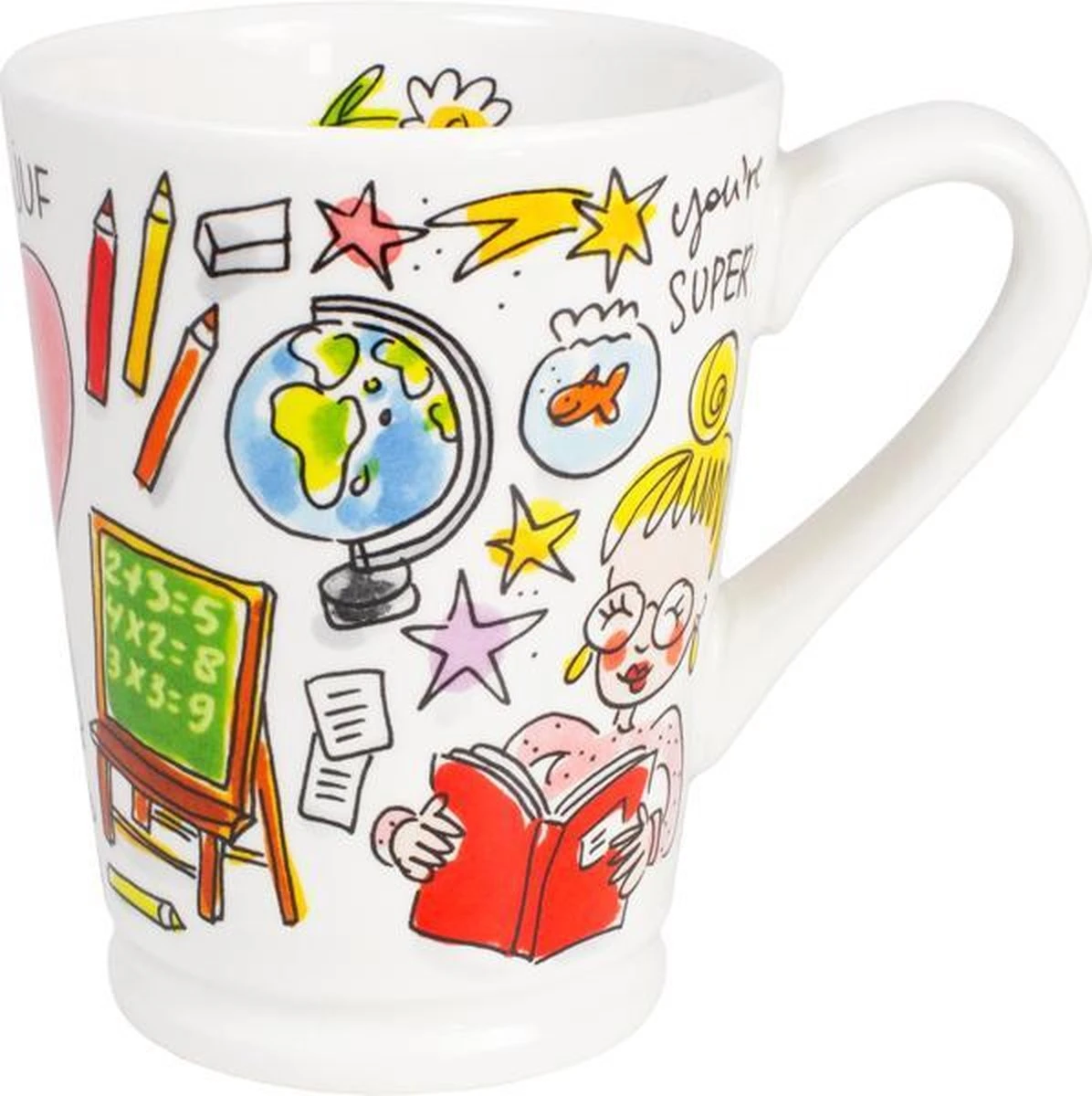 Deze XL beker is het perfecte cadeau om jouw liefste juf in het zonnetje te zetten. Op de beker staan verschillende illustraties die met juffen te maken hebben: een krijtbord, een bos bloemen, een wereldbol en teksten zoals: “Liefste juf” en “Thanks for helping me grow”. Aan de binnenkant van de beker staat een schattig madeliefje afgebeeld. Zo kan de juf een heerlijke kop koffie of thee drinken uit een vrolijke beker.