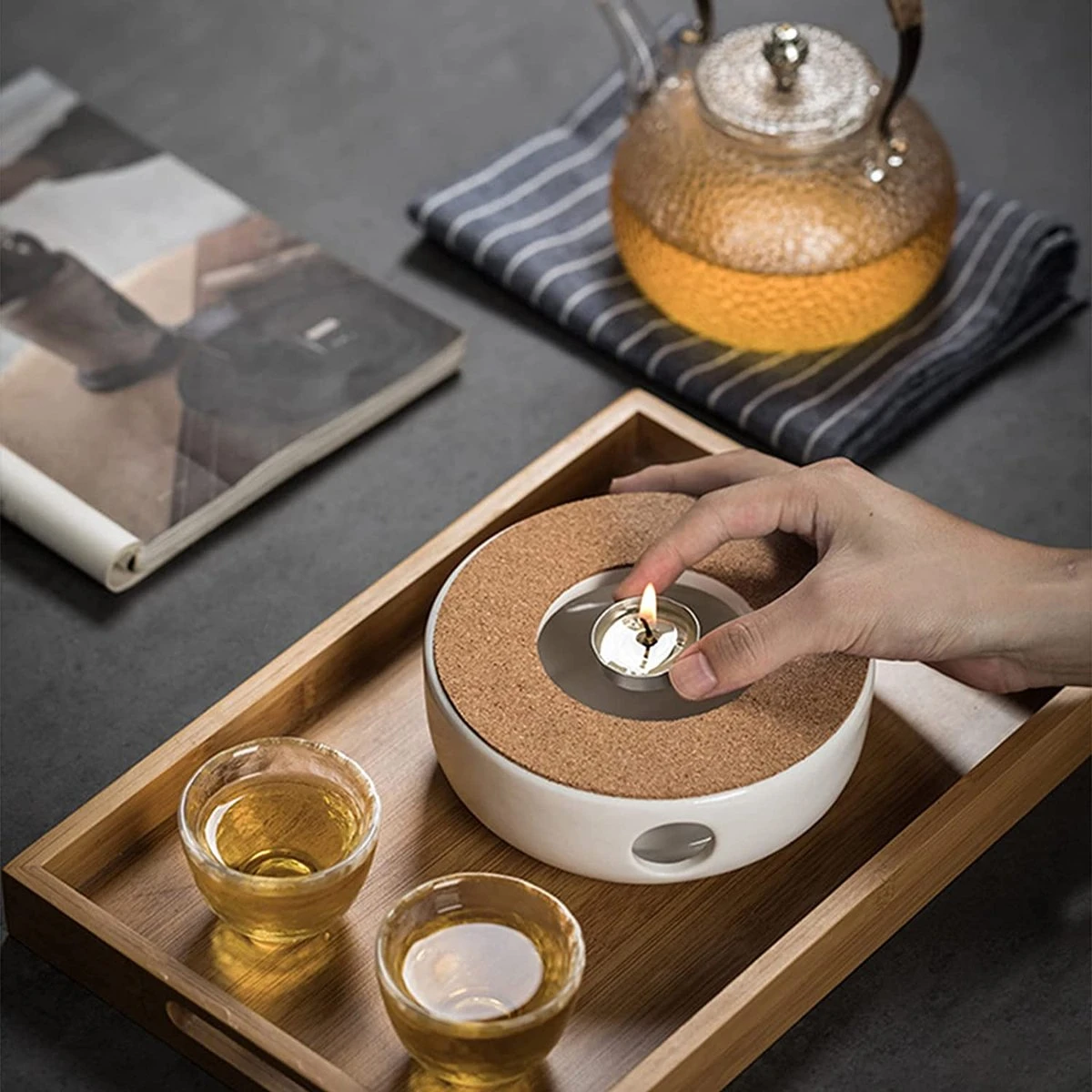 - Hoge kwaliteit: de basis bestaat uit hoogwaardig keramiek en het frame van het theepotblad bestaat uit een kurkhouder, die waterdicht en valbestendig, duurzaam en belastbaar is. Houd de temperatuur van thee en koffie effectief vast. Opmerking: tijdens het verwarmen niet direct met de handen aanraken om brandwonden te voorkomen.