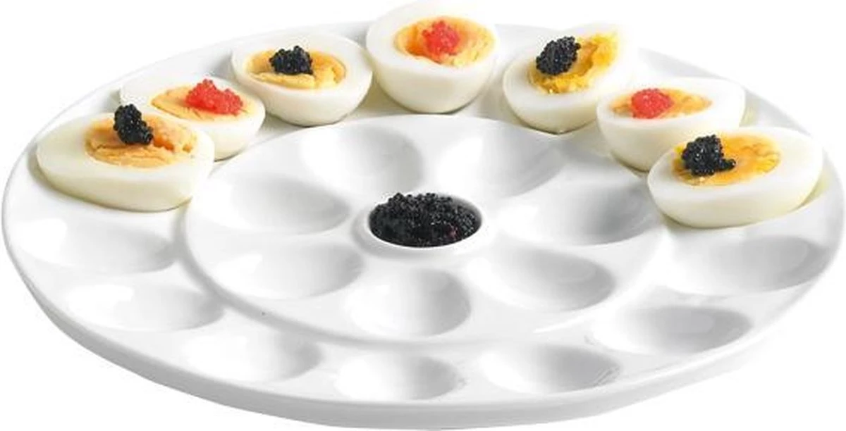 - 14 eierdopjes in de buitenringste, 7 in de middelste, 1 dipsaus in het binnenste