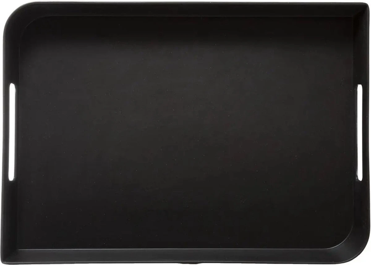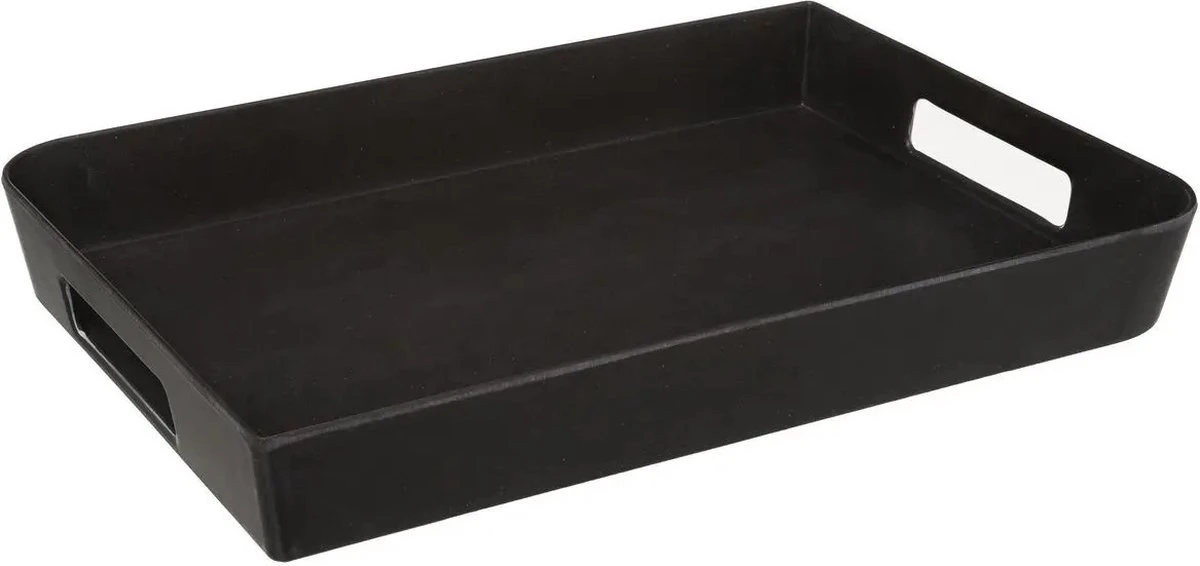 Dienblad/serveerblad rechthoekig zwart. Dit serveerblad beschikt over handige handvaten en heeft een moderne uitstraling omdat het zowel ronde als puntige hoeken heeft. Makkelijk schoon te maken met een vochtige doek. Afmeting: 35 x 25 x 4,5 cm. Materiaal: kunststof.