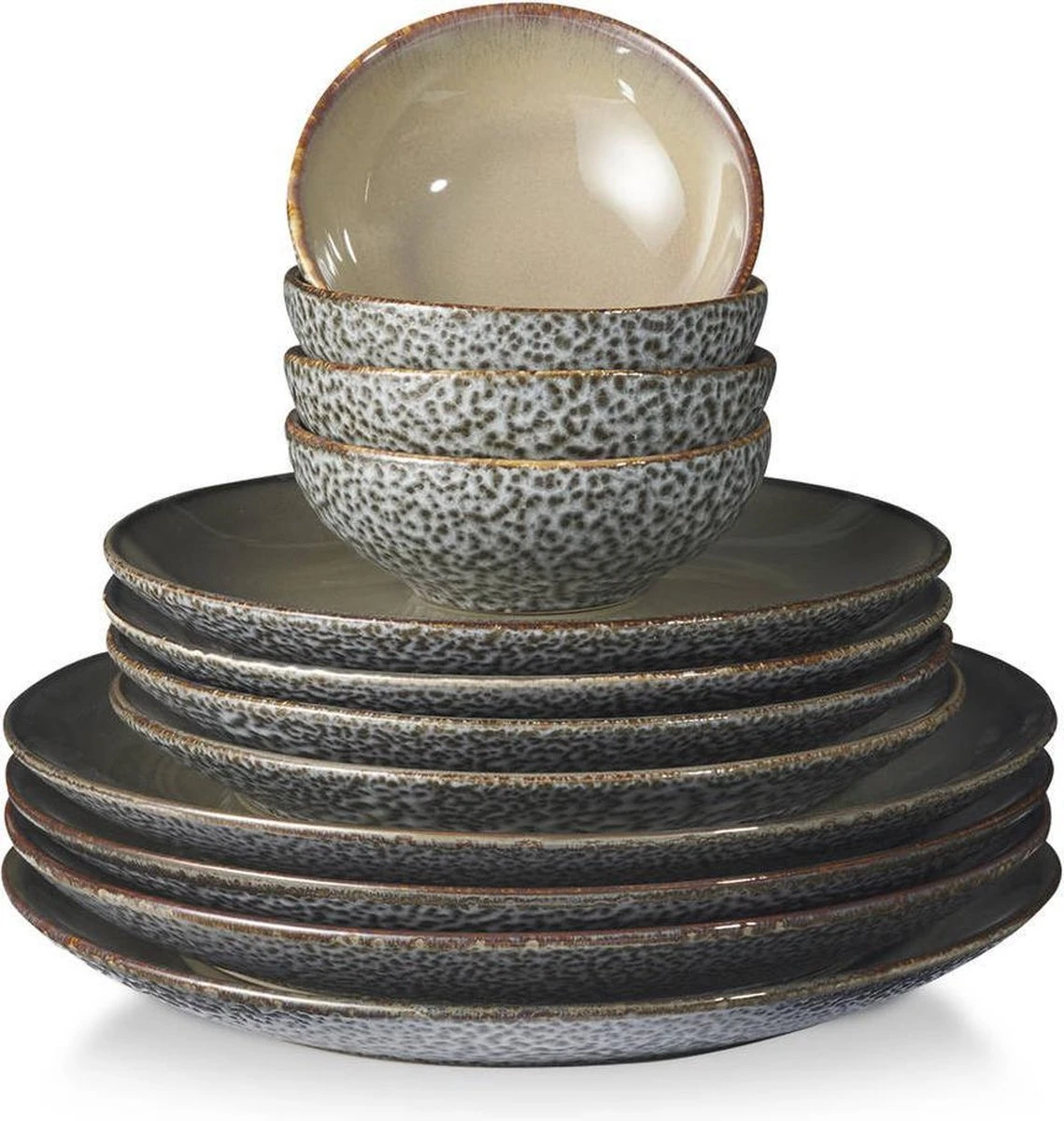 Dit 12-delige Herman den Blijker servies is uitgevoerd in hard aardewerk. Door toepassing van een ‘reactief’glazuurproces hebben de producten een mooie diep warmgrijze kleur. De buitenzijde heeft een speciaal stroer voelbaar patroon waardoor het servies een stoere uitstraling krijgt. De onderdelen zijn los na te bestellen.