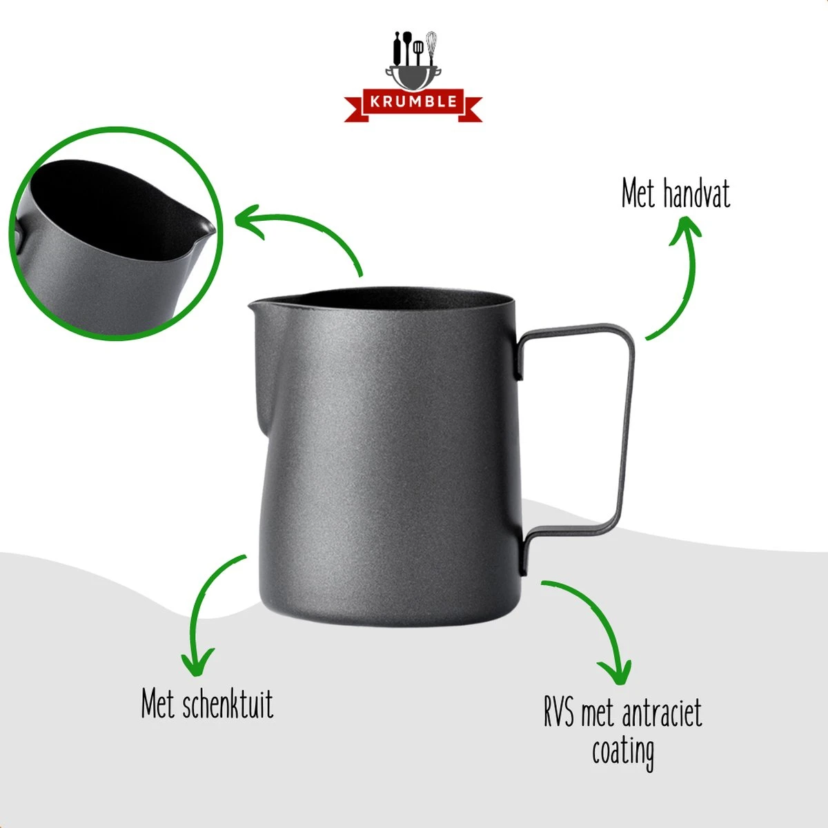 Dit Krumble melkkannetje in antraciet is onmisbaar als je een vakkundige caffe latte of cappuccino wilt schenken. Deze melkopschuimkan is niet alleen zeer praktisch. Ze heeft ook een klassevolle uitstraling. Het opschenken van koffie zoals een echte barista maakt van het tafelen een echt feest. Met deze melkopschuimkan maak jij het je makkelijker!