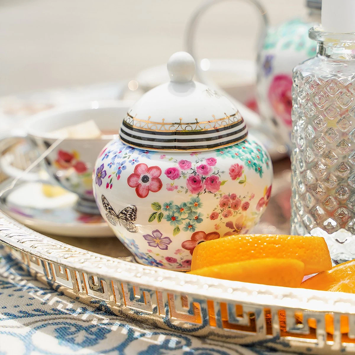 Dit Melli Mello Nora suikerpotje staat prachtig op jouw koffietafel. Het prachtige bloemendecor maakt dit item schattig en kleurrijk. De basiskleur is wit waarop roze, blauwe, paarse en turkooise bloemen te zien zijn. Dit in combinatie met zwart witte en gouden details maakt dit item vrolijk, fris en modern. Maak jouw koffie moment compleet met het melkkannetje of andere leuke serviesitems. De Melli Mello Nora suikerpot heeft een inhoud van 280 milliliter en is gemaakt van porselein.