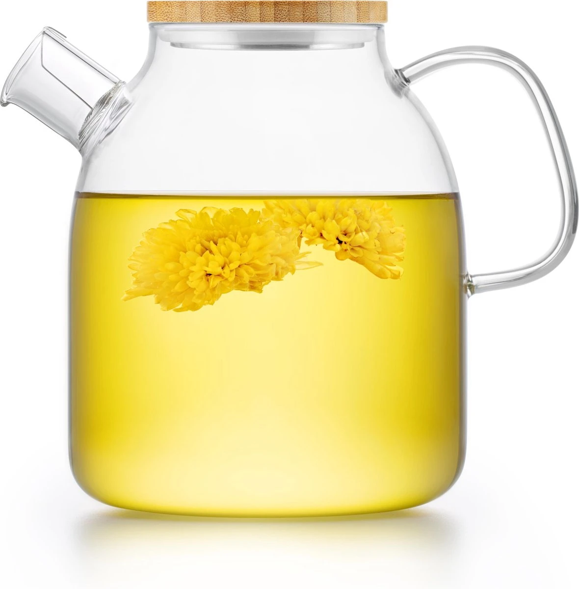 Strak vormgegeven mooie hoge theepot van Samadoyo met een inhoud van 1600 ml. De pot heeft een bamboe deksel met een spiraalvormige filter in de schenktuit. Het borosilicaat glas is krasvast, hitte en koude bestending en ijzersterk. Met deze moderne theepot zet u op stijlvolle wijze een heerlijke thee.