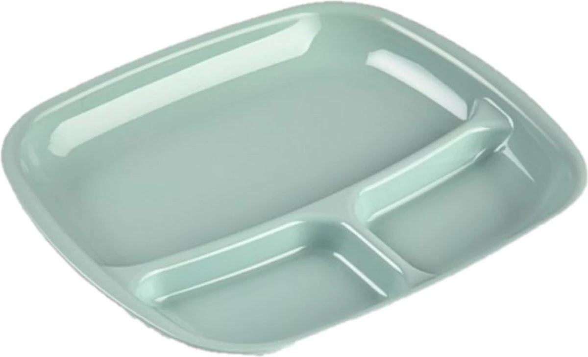 Set van 4x stuks camping/fondu/bbq kunststof borden 3-vaks. Groen bord met 3 vakjes voor vlees en/of sauzen. Ideaal voor de barbecue, fondue of gourmet. Afmeting: ca. 21 x 24 x 3 cm. Geschikt voor de vaatwasser.